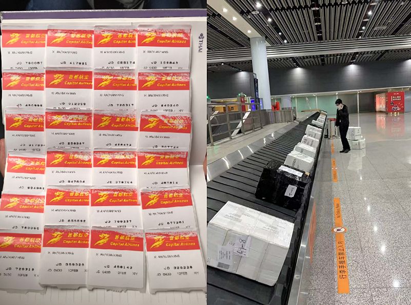 2月5日,首架貨機(jī)從西班牙馬德里(CA1026次航班)出發(fā),于當(dāng)天早上7:40分抵達(dá)了河南新鄭國際機(jī)場。在這架飛機(jī)上,載滿了口罩、護(hù)目鏡、防護(hù)服、消毒液等疫情急需物資,總計(jì)18個(gè)托盤,約5噸,371336件,總價(jià)值人民幣377450元。