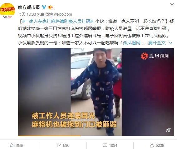比如,一家三口在家里圍桌打麻將,突然有防疫工作人員進來,不由分說開始打砸,一位年輕人表示不服,竟被連抽幾個耳光;一位中年男子下樓買菜,進小區時拒絕登記,與工作人員產生沖突,最終被幾名工作人員摁倒在地;一位東北大娘在外溜達時沒戴口罩,與社區干部發生沖突,甚至拳腳相加,最終被戴上手銬抓進警車……
