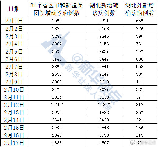 2月17日,31個省(自治區、直轄市)和新疆生產建設兵團報告新增新冠肺炎確診病例1886例,湖北新增確診病例1807例。這就是說,除湖北外的30個省區市和新疆生產建設兵團昨日新增確診79例,這是自2月3日來新增病例到達高點890例以來的首次兩位數報告,也是第14連降。?