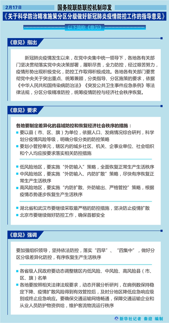 新華社北京2月18日電? 2月17日,國務院聯防聯控機制印發《關于科學防治精準施策分區分級做好新冠肺炎疫情防控工作的指導意見》(以下簡稱《意見》)。