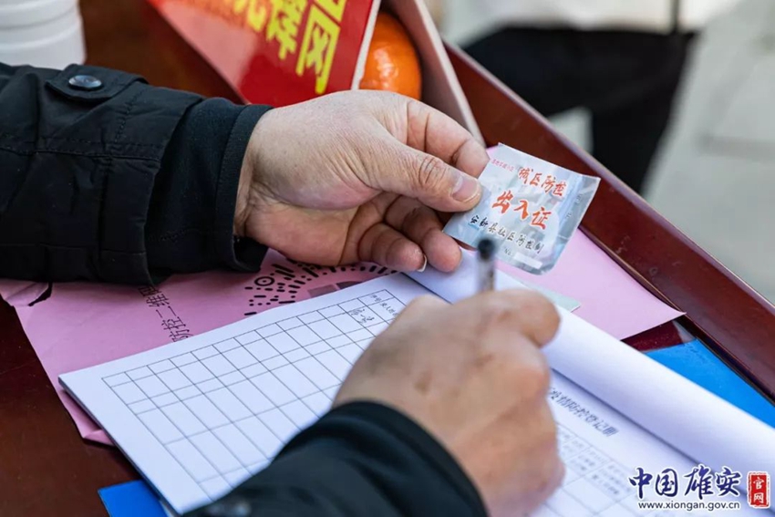 疫情防控工作人員為濕地華城小區(qū)住戶辦理出入證。中國雄安官網(wǎng)記者毛鶴然 攝