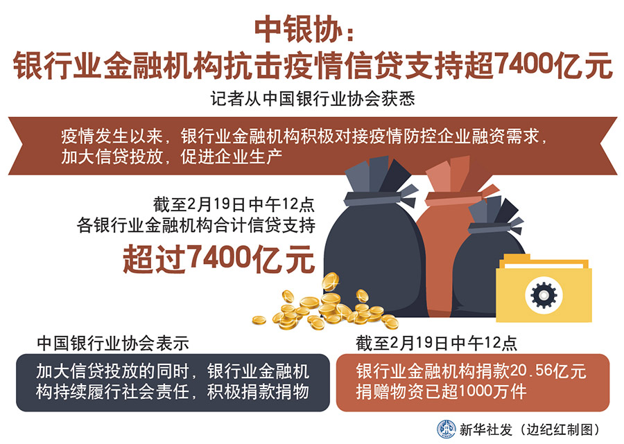新華社北京2月20日電(記者李延霞)記者從中國銀行業協會獲悉,疫情發生以來,銀行業金融機構積極對接疫情防控企業融資需求,加大信貸投放,促進企業生產。截至2月19日中午12點,各銀行業金融機構合計信貸支持超過7400億元。