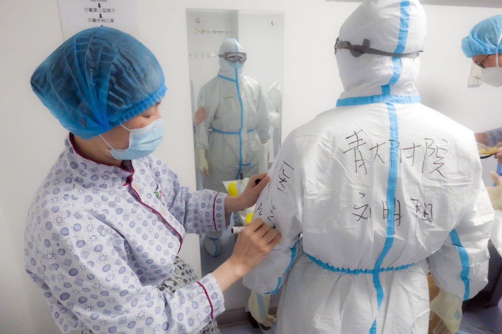 兩位醫(yī)護(hù)人員按照標(biāo)準(zhǔn)流程為即將進(jìn)入病區(qū)的同事穿戴防護(hù)服。