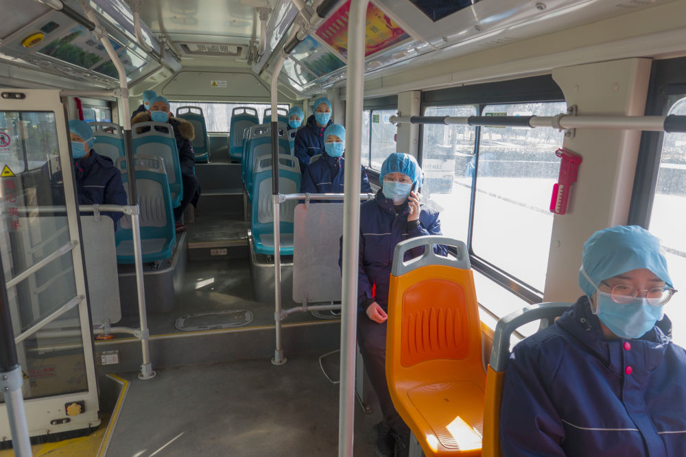 青島大學(xué)附屬醫(yī)院醫(yī)療隊(duì)醫(yī)護(hù)人員下班后乘大巴返回駐地,分散坐車,減少交叉感染風(fēng)險(xiǎn)。