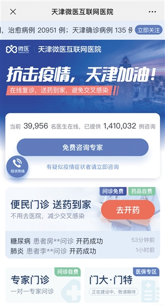 除針對新冠肺炎的免費義診之外,圍繞慢性病和常見病的便民門診、心理援助專區和醫護人員心理關懷通道也快速開通,天津微醫互聯網醫院率先成為天津抗擊疫情的“第二戰場”。