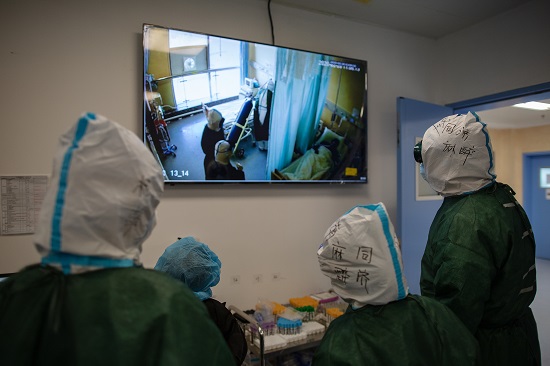 三位隊員監控即將插管的病人及病房準備情況,來自華山醫院的麻醉護士已在病房內準備。