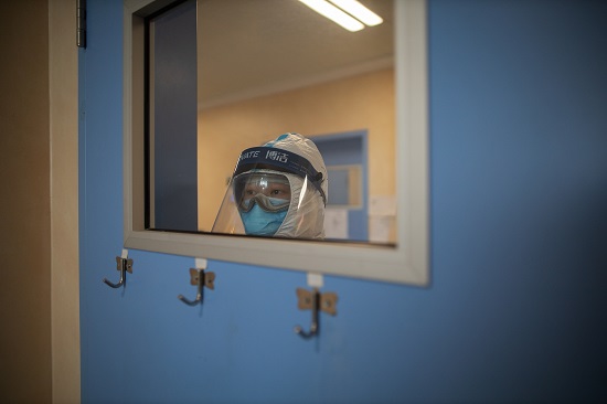 結束任務的隊員在等候著脫掉防護服,走出4個隔離區,才可稍微放松一些。
