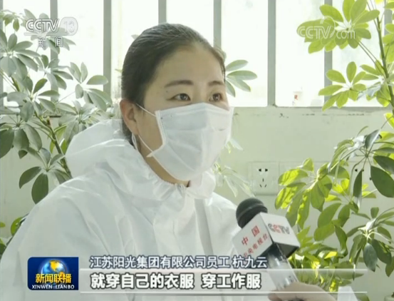 江蘇陽光集團有限公司員工 杭九云:完全不一樣,我們平時干活的話,就穿自己的工作服,穿廠服就好了,現在來了,要穿這個密不透風,我感覺醫生還要比我們不容易,他們還要去救人,其實他們比我們還要更累,所以堅持吧。