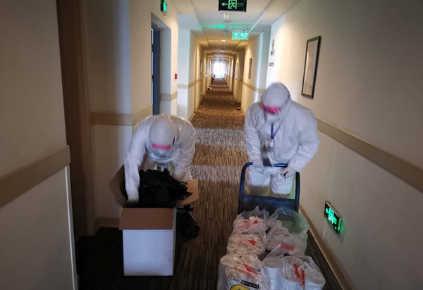走馬嶺“康復驛站”負責人、走馬嶺街工委副書記陶勇介紹,目前整個東西湖區共有5家“康復驛站”。由于走馬嶺“康復驛站”此前作為兩次檢測轉陰患者的“待出院隔離觀察點”,所以酒店已經按照“三區兩通道”要求進行了改造。昨天入住的出院患者來自各個醫院,包括火神山醫院、東西湖區人民醫院、兒童醫院以及各個方艙醫院,由區里和街道調配車輛完成轉運。陶勇說:“因為這里最開始作為‘雙陰’的一個待出院隔離點,所以就按照‘三區兩通道’的格局來制定。一個是病人的通道,另一個是醫生的通道,病人走了以后,我們進行殺毒、登記,然后安排到酒店的房間。我們旁邊也征用了一個別人的公司,在上面打通了一個連接酒店那邊的通道。”