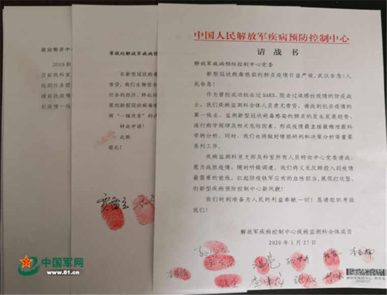 一份份斗志昂揚的請戰書,一個個鮮艷奪目的紅手印,一顆顆無私無畏的赤子心,如一團團吞噬“疫魔”的烈火,凝聚在黨旗軍旗下,展現著軍隊疾控人信念如鐵、臨危不懼的赤膽忠心。