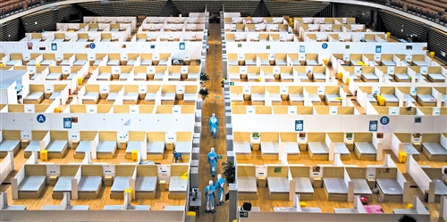 武漢體育中心方艙醫院送走最后一批痊愈患者,正式休艙。這是工作人員在艙內進行清理作業。 新華社記者 肖藝九攝