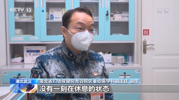 湖北省婦幼保健院光谷院區重癥醫學科副主任 趙榮:他隨時都有可能處在一種搶救狀態,一個班4個醫生6個護士,甚至要6個護士進紅區,大家從進來到出去沒有一刻在休息。