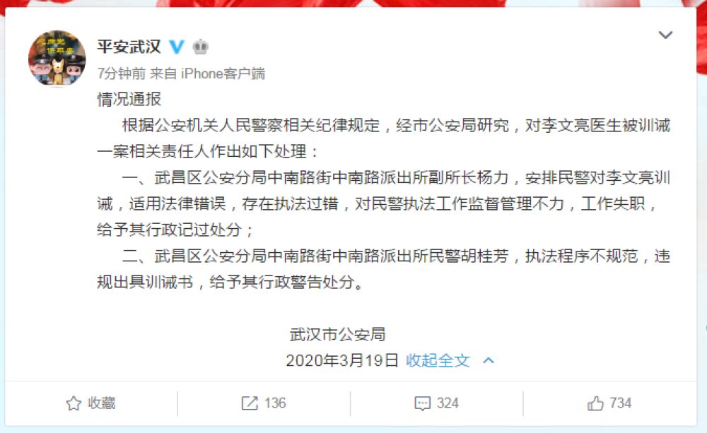 根據(jù)公安機關(guān)人民警察相關(guān)紀律規(guī)定,經(jīng)市公安局研究,對李文亮醫(yī)生被訓(xùn)誡一案相關(guān)責任人作出如下處理: