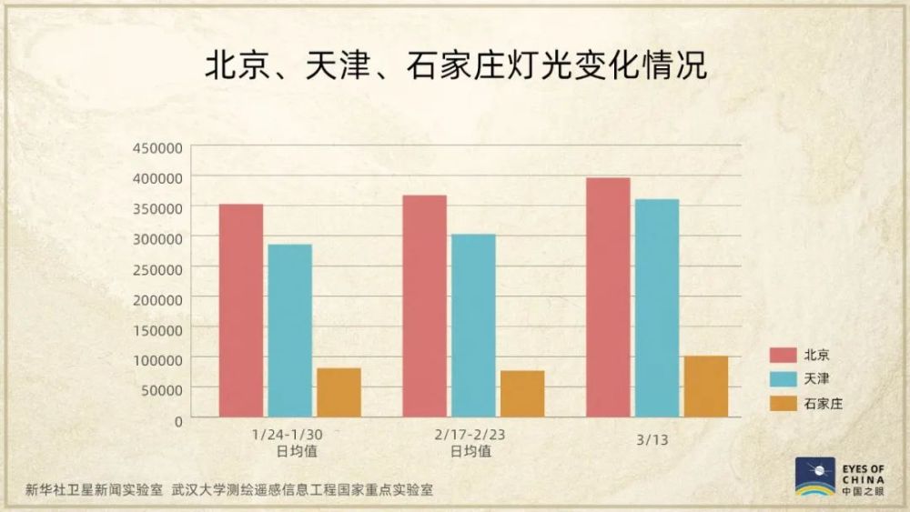 這是春節期間至3月13日,京津冀地區夜間燈光亮度變化情況,2月下旬起亮度出現提升。