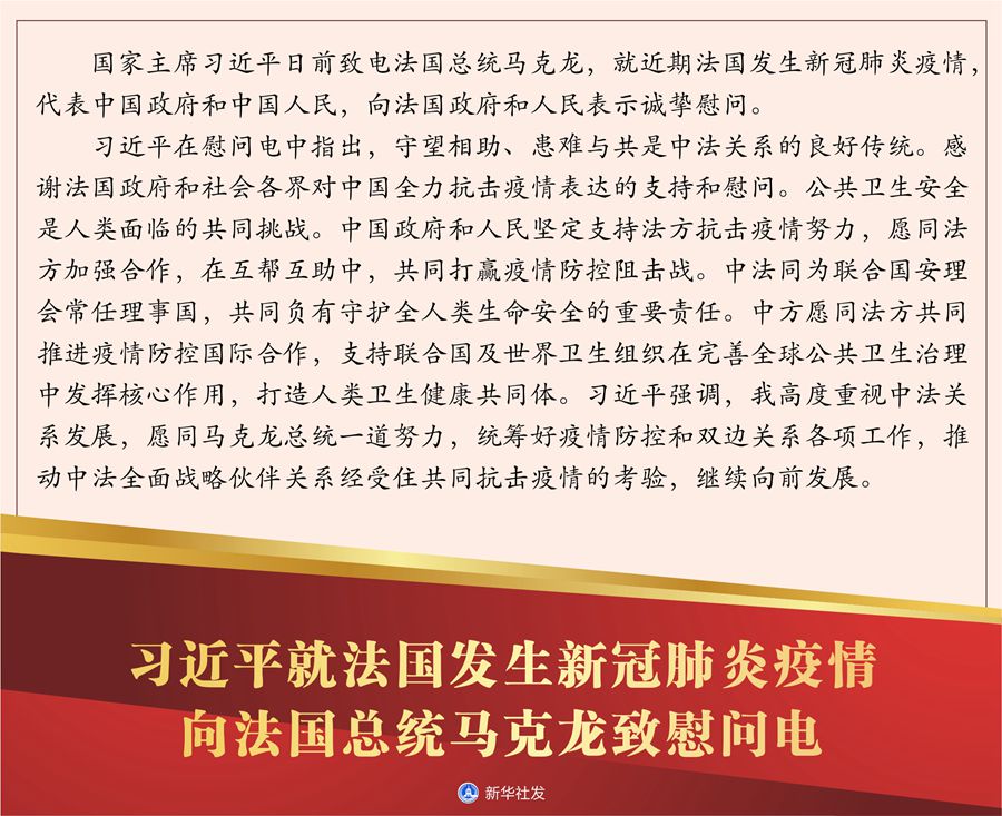 習近平在慰問電中指出,守望相助、患難與共是中法關系的良好傳統。感謝法國政府和社會各界對中國全力抗擊疫情表達的支持和慰問。公共衛生安全是人類面臨的共同挑戰。中國政府和人民堅定支持法方抗擊疫情努力,愿同法方加強合作,在互幫互助中,共同打贏疫情防控阻擊戰。中法同為聯合國安理會常任理事國,共同負有守護全人類生命安全的重要責任。中方愿同法方共同推進疫情防控國際合作,支持聯合國及世界衛生組織在完善全球公共衛生治理中發揮核心作用,打造人類衛生健康共同體。習近平強調,我高度重視中法關系發展,愿同馬克龍總統一道努力,統籌好疫情防控和雙邊關系各項工作,推動中法全面戰略伙伴關系經受住共同抗擊疫情的考驗,繼續向前發展。