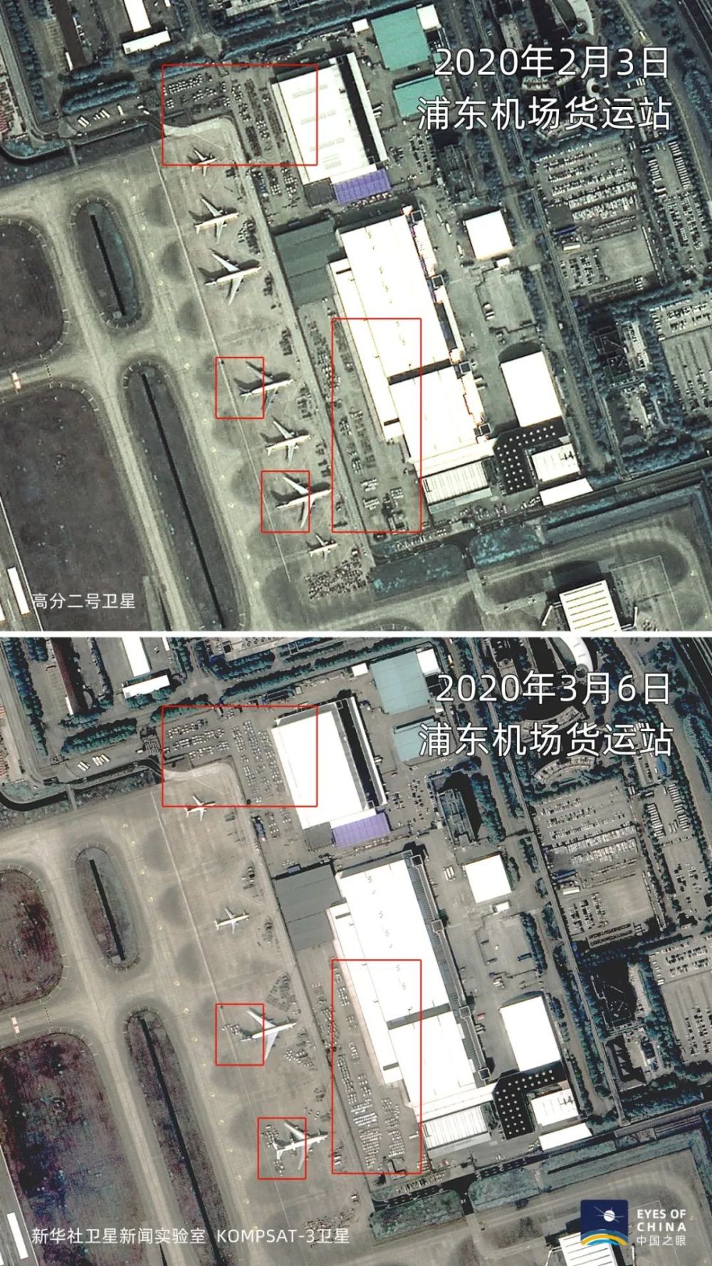 浦東機場貨運站,2月3日多架停放在地面的飛機裝卸貨物跡象不明顯。3月6日,地面停放飛機數量減少,且多在進行裝卸作業(yè),堆放的貨物也大大增多。