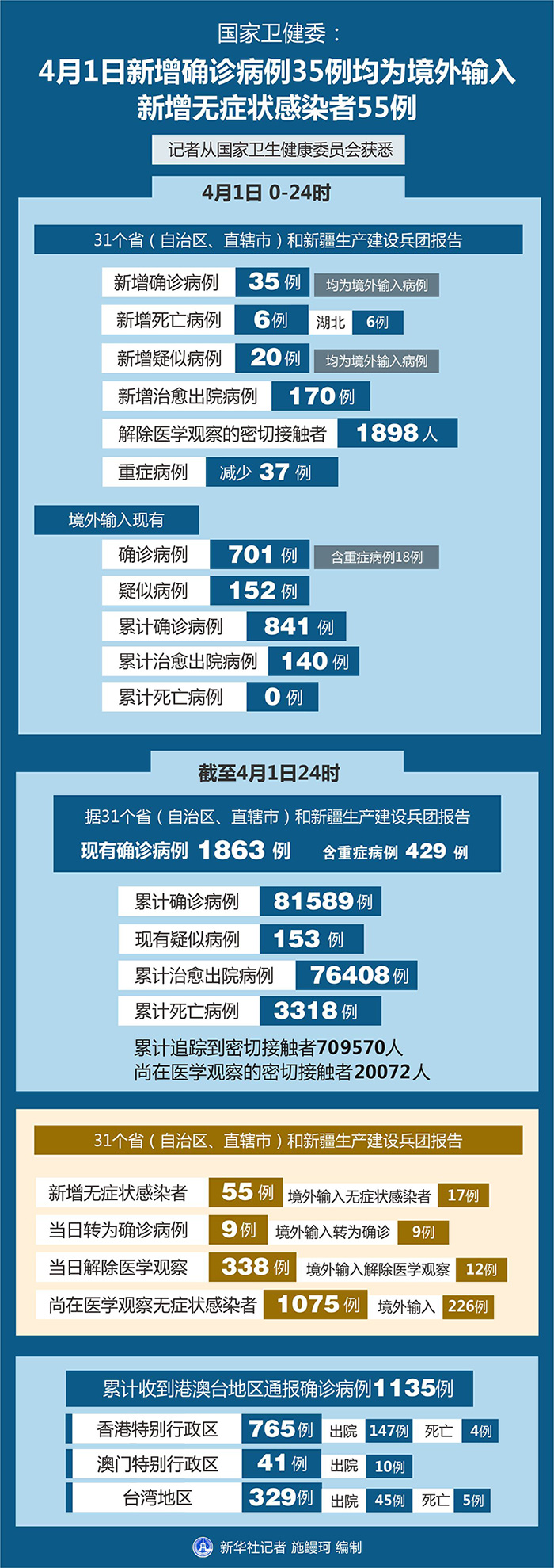 截至4月1日24時,據31個省(自治區、直轄市)和新疆生產建設兵團報告,現有確診病例1863例(含重癥病例429例),現有疑似病例153例。累計確診病例81589例,累計治愈出院病例76408例,累計死亡病例3318例,累計追蹤到密切接觸者709570人,尚在醫學觀察的密切接觸者20072人。