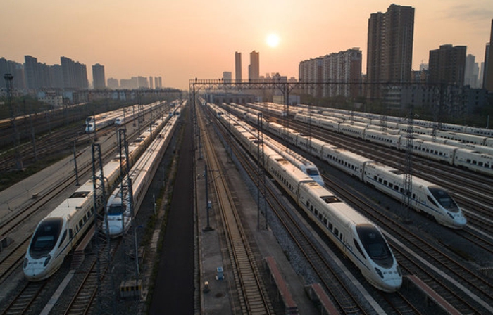在武漢動車段,列車4月8日停靠在存車線上準備投入運行(無人機照片)。新華社記者肖藝九攝