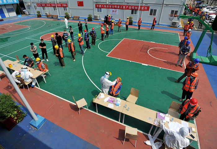 在中建八局武漢中央文化區(qū)萬達項目部,返崗員工4月7日在接受核酸和抗體指標檢測。 新華社發(fā)(史偉 攝)