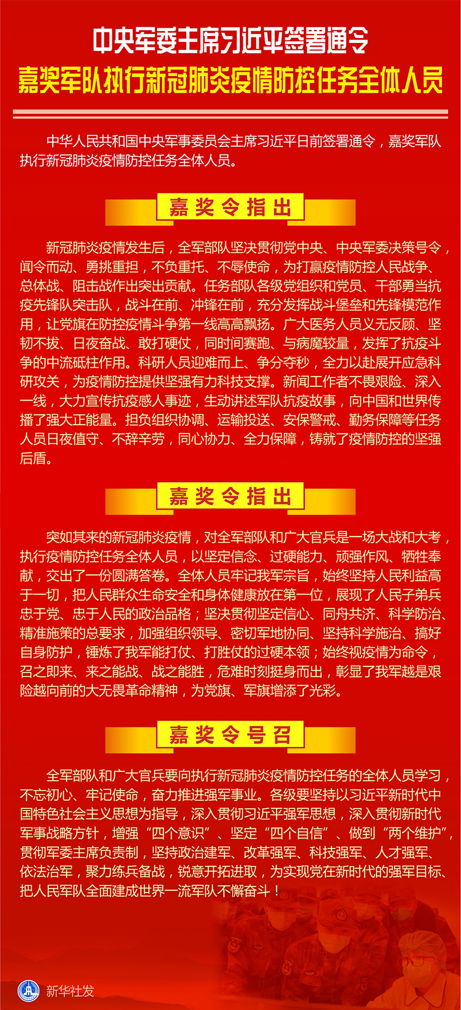 嘉獎令號召,全軍部隊和廣大官兵要向執行新冠肺炎疫情防控任務的全體人員學習,不忘初心、牢記使命,奮力推進強軍事業。各級要堅持以習近平新時代中國特色社會主義思想為指導,深入貫徹習近平強軍思想,深入貫徹新時代軍事戰略方針,增強“四個意識”、堅定“四個自信”、做到“兩個維護”,貫徹軍委主席負責制,堅持政治建軍、改革強軍、科技強軍、人才強軍、依法治軍,聚力練兵備戰,銳意開拓進取,為實現黨在新時代的強軍目標、把人民軍隊全面建成世界一流軍隊不懈奮斗!