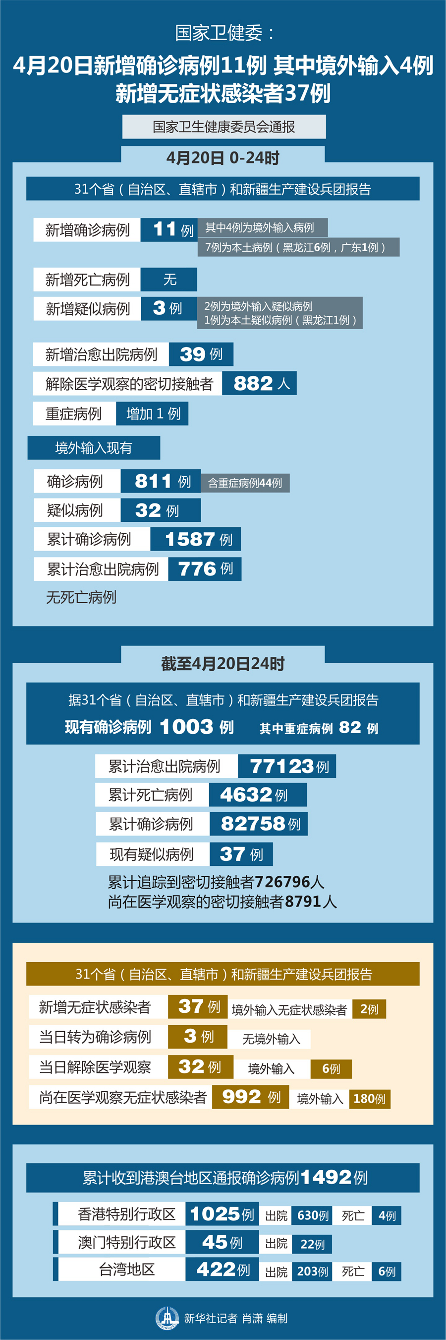 截至4月20日24時,據31個?。ㄗ灾螀^、直轄市)和新疆生產建設兵團報告,現有確診病例1003例(其中重癥病例82例),累計治愈出院病例77123例,累計死亡病例4632例,累計報告確診病例82758例,現有疑似病例37例。累計追蹤到密切接觸者726797人,尚在醫學觀察的密切接觸者8791人。