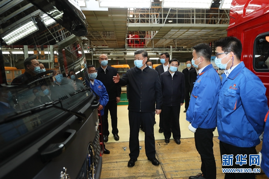 22日,習近平在西安考察復工復產和經濟社會恢復運行等情況。陜西汽車控股集團有限公司是西北地區有影響力的制造企業。習近平詳細了解產品研發、生產、銷售和復工復產情況,對他們克服疫情影響創產銷歷史新高表示贊賞。總裝車間內一片繁忙景象。習近平察看內飾生產線、總裝配生產線,饒有興致登上裝配完成的民用重型卡車駕駛室,向技術人員詢問產品性能和操作流程。習近平強調,制造業是國家經濟命脈所系。國有大型企業要發揮主力軍作用,在抓好常態化疫情防控的前提下,帶動上下游產業和中小企業全面復工復產。習近平指出,新時代陜西要有勇立潮頭、爭當時代弄潮兒的志向和氣魄,既要抓住西部大開發、共建“一帶一路”等重大機遇,又要善于從眼前的危機和挑戰中搶抓和創造機遇,不斷發展新模式、新業態、新技術、新產品,創造新的更大業績,邁上新的臺階。