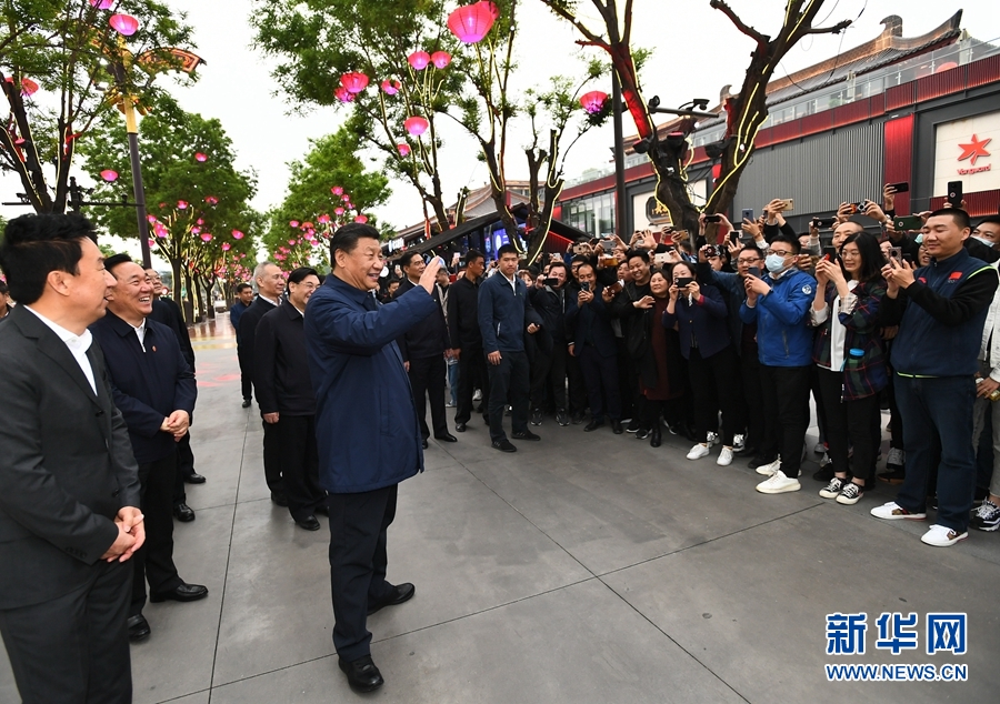 4月20日至23日,中共中央總書記、國家主席、中央軍委主席習近平在陜西考察。這是4月22日,習近平在西安大唐不夜城步行街考察時,向游客揮手致意。 新華社記者 謝環馳 攝