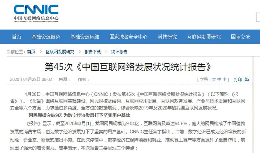 4月28日,中國互聯網絡信息中心(CNNIC)發布第45次《中國互聯網絡發展狀況統計報告》(以下簡稱:《報告》)。《報告》圍繞互聯網基礎建設、網民規模及結構、互聯網應用發展、互聯網政務發展、產業與技術發展和互聯網安全等六個方面,力求通過多角度、全方位的數據展現,綜合反映2019年及2020年初我國互聯網發展狀況。