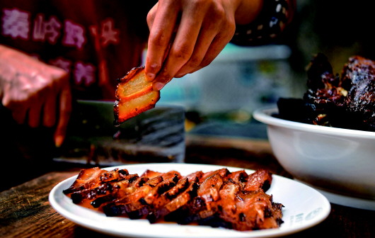 周紅珍用蒸熟的臘肉招待慕名而來的客人(4月27日攝)。
