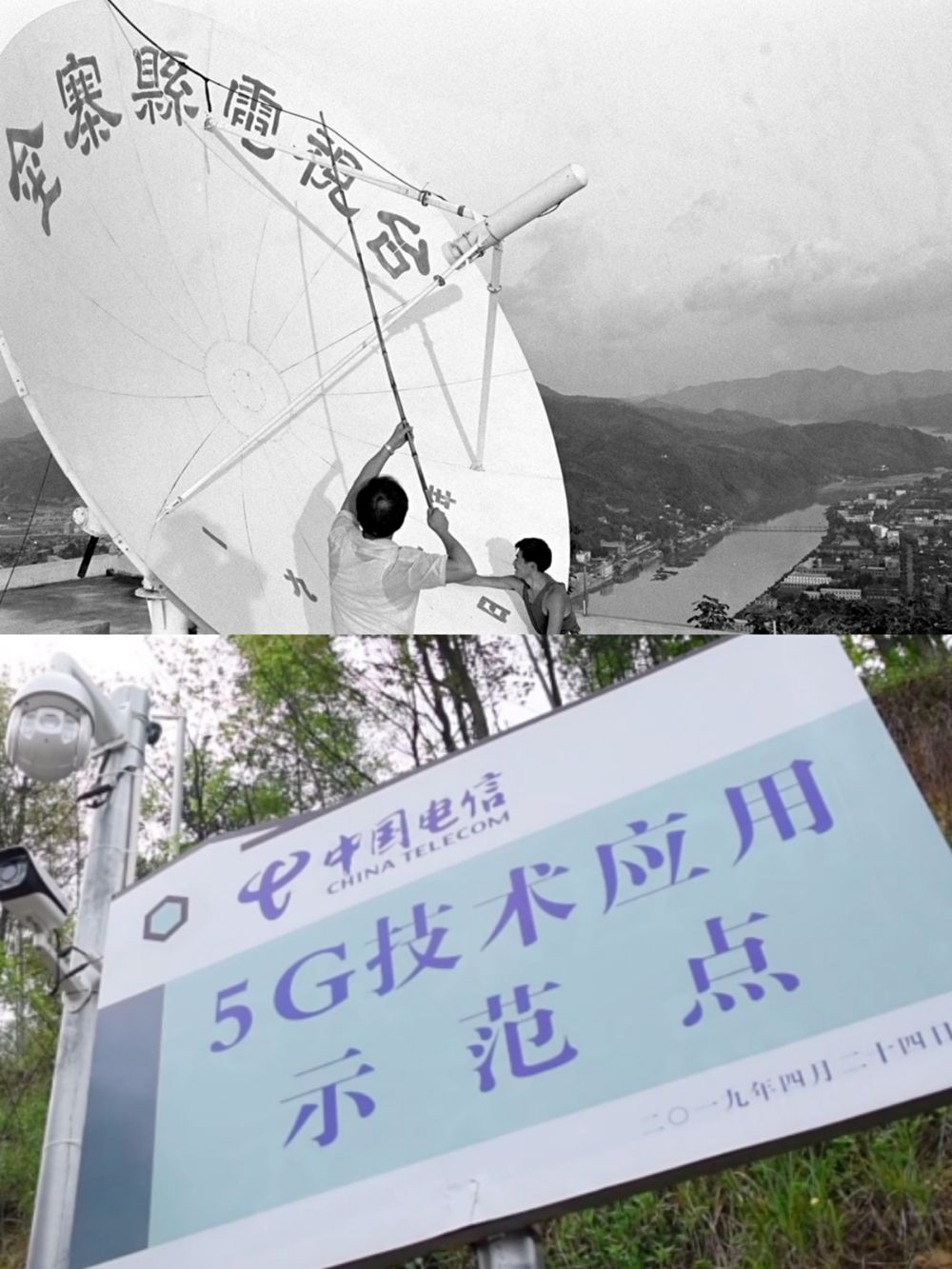 (上圖:1987年,金寨縣建成梅山地面衛星接收站,新華社記者李錦攝;2019年,大灣村開通5G信號。新華社記者湯陽攝)