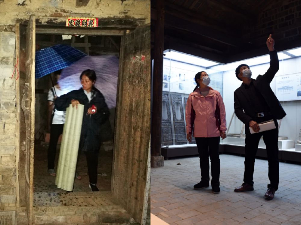 (左圖:2017年7月的一場大暴雨中,大灣村第一書記余靜轉移危房中群眾,新華社記者陳諾攝;右圖:2020年3月19日,大灣村在建農俗博物館內,余靜(左)和施工人員交流。新華社發周牧攝)