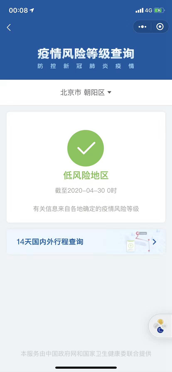 4月30日,疫情風險等級查詢系統顯示,北京朝陽區降為低風險地區。此前,朝陽區為全國唯一高風險地區。4月29日 ,北京市宣布4月30日起公共衛生應急響應級別由一級降至二級。(李金磊)