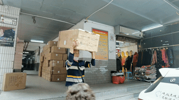一小時后,一輛貨車駛進狹窄的街區,停在十幾米遠外。冉光輝瞬間抖擻起精神,移下一個近半人高的箱子放到左邊肩頭,兩臂環抱貨物,小跑著往車上運送。專職做“棒棒”多年,這一套程序他再熟悉不過。