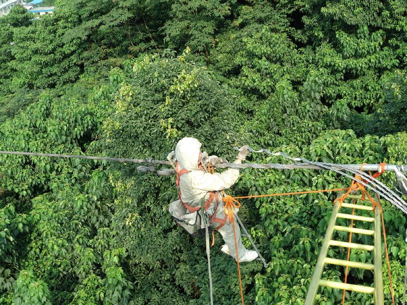 第一次爬塔時,田貴陽心里直打怵。“訓練的時候,師傅教我們不要往下看,往上看,看著腳釘往上爬。”現在,工作12年的他早已輕車熟路,120米高的過江塔,蹭蹭蹭六七分鐘就爬了上去。而上了塔工作才剛開始,要是碰上任務多,在半空一待就得五六個小時。
