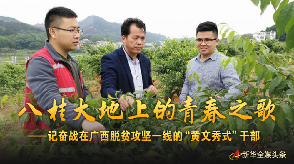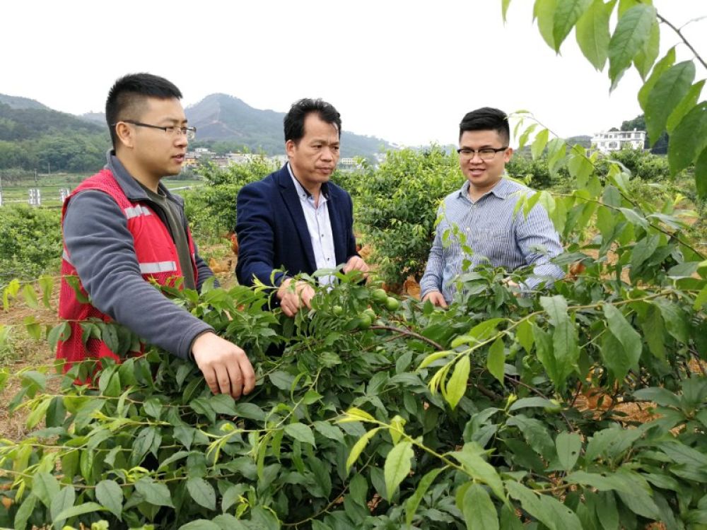 廣西馬山縣林圩鎮伏興村駐村第一書記周福波(左一)在查看村里已經掛果的三華李(4月25日攝)。新華社記者 何偉 攝