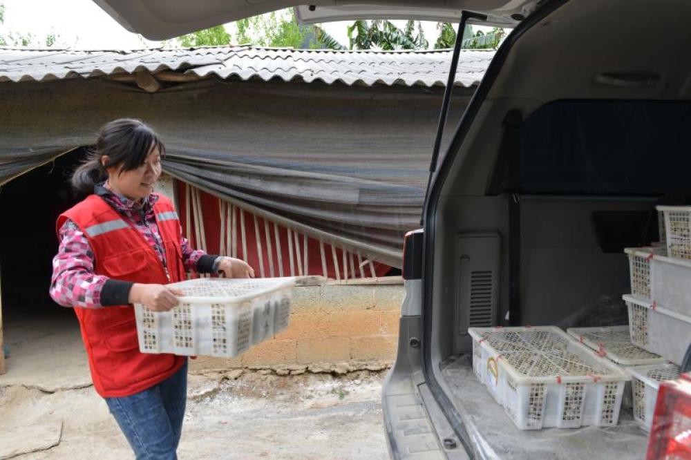 廣西百色市德保縣敬德鎮馱信村駐村第一書記李梅在裝運即將出售的鵪鶉蛋(資料照片)。新華社發