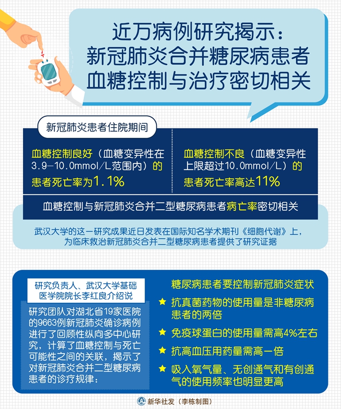 新華社武漢5月4日電(記者 王賢)新冠肺炎患者住院期間,血糖控制良好(血糖變異性在3.9-10.0mmol/L范圍內)的患者死亡率為1.1%,血糖控制不良(血糖變異性上限超過10.0mmol/L)的患者死亡率高達11%,血糖控制與新冠肺炎合并二型糖尿病患者病亡率密切相關。武漢大學的這一研究成果近日發表在國際知名學術期刊《細胞代謝》上,為臨床救治新冠肺炎合并二型糖尿病患者提供了研究證據。