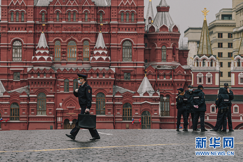 5月4日,一名警察(左)經過俄羅斯莫斯科紅場。 為遏制新冠疫情蔓延,3月30日起莫斯科和俄多城實施居家隔離制度。 新華社發(葉甫蓋尼·西尼岑攝)