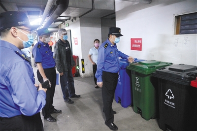 昨日,城管隊員檢查翠微大廈物業的垃圾分類收集容器。北京市城管執法局供圖