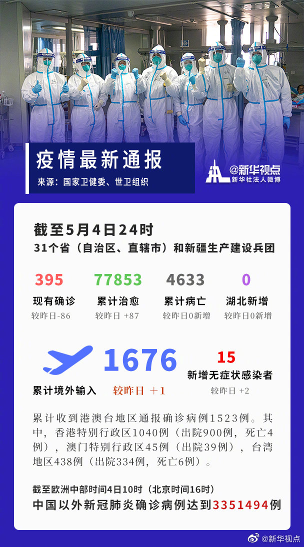 截至5月4日24時,據(jù)31個省(自治區(qū)、直轄市)和新疆生產(chǎn)建設兵團報告,現(xiàn)有確診病例395例(其中重癥病例29例),累計治愈出院病例77853例,累計死亡病例4633例,累計報告確診病例82881例,現(xiàn)有疑似病例2例。累計追蹤到密切接觸者735240人,尚在醫(yī)學觀察的密切接觸者7152人。