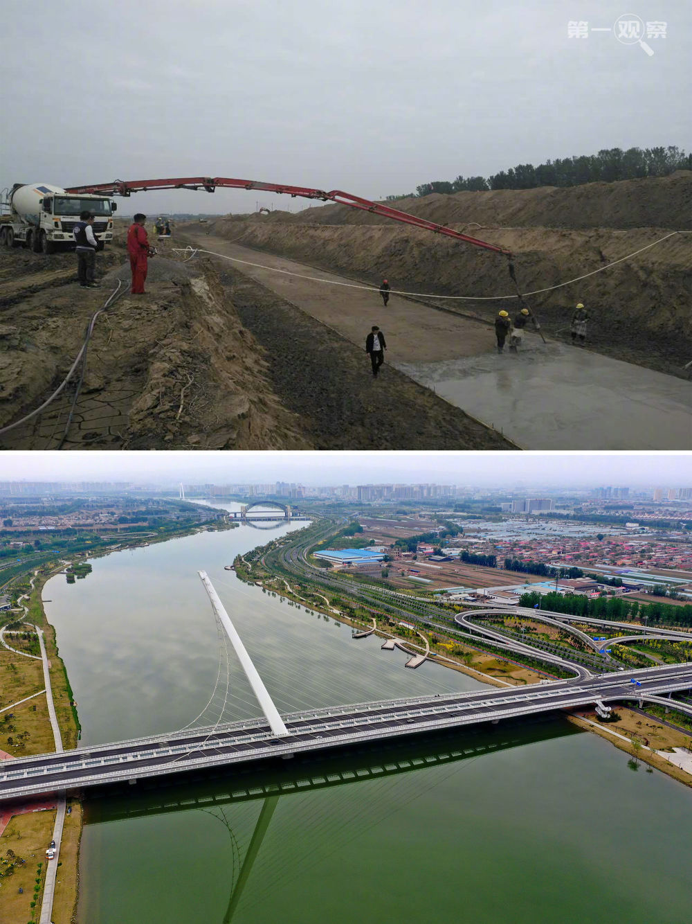 ?↑拼版照片:上圖為2017年10月5日拍攝的太原市汾河城區(qū)段治理美化三期工程施工場(chǎng)景(資料照片);下圖為2020年4月29日無人機(jī)拍攝的太原市汾河兩岸景色(新華社記者 曹陽(yáng) 攝)。