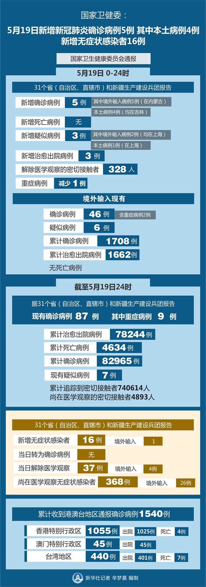 截至5月19日24時,據31個省(自治區、直轄市)和新疆生產建設兵團報告,現有確診病例87例(其中重癥病例9例),累計治愈出院病例78244例,累計死亡病例4634例,累計報告確診病例82965例,現有疑似病例7例。累計追蹤到密切接觸者740614人,尚在醫學觀察的密切接觸者4893人。