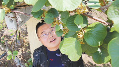 姚力在觀察獼猴桃花蕾長勢。本報記者 原韜雄攝