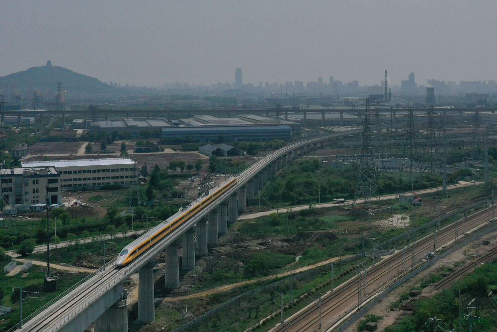 4月22日,在商合杭高鐵合肥至湖州段,聯調聯試綜合檢測列車經過浙江湖州境內(無人機照片)。新華社記者 黃宗治 攝