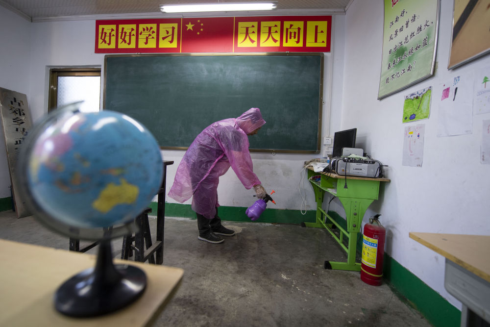 開學前兩周,學校老師在當地衛生院的指導下,對校內教室、宿舍、食堂等地進行消殺和通風。