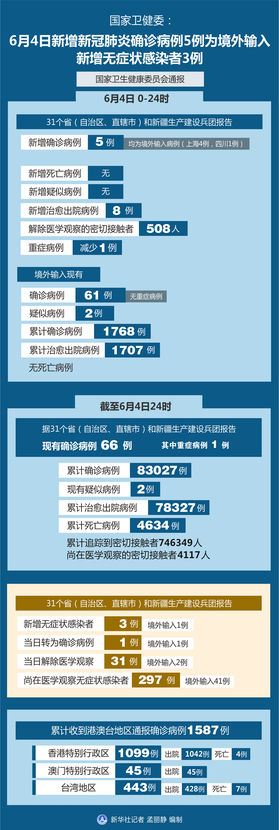 截至6月4日24時(shí),據(jù)31個(gè)省(自治區(qū)、直轄市)和新疆生產(chǎn)建設(shè)兵團(tuán)報(bào)告,現(xiàn)有確診病例66例(其中重癥病例1例),累計(jì)治愈出院病例78327例,累計(jì)死亡病例4634例,累計(jì)報(bào)告確診病例83027例,現(xiàn)有疑似病例2例。累計(jì)追蹤到密切接觸者746349人,尚在醫(yī)學(xué)觀察的密切接觸者4117人。