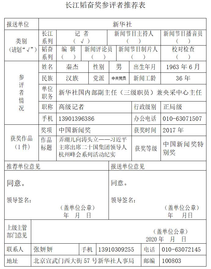 經(jīng)新華社編務(wù)會(huì)議投票表決并經(jīng)新華社黨組會(huì)議審議,確定秦杰同志為新華社推薦的第十六屆長(zhǎng)江韜奮獎(jiǎng)候選人。