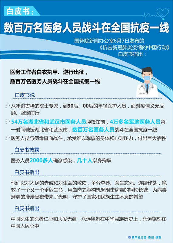 新華社北京6月7日電(記者田曉航)國務院新聞辦公室7日發布的《抗擊新冠肺炎疫情的中國行動》白皮書指出,醫務工作者白衣執甲、逆行出征,數百萬名醫務人員戰斗在全國抗疫一線。