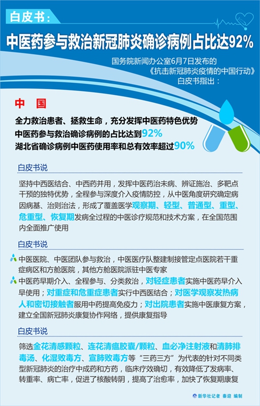 新華社北京6月7日電(記者田曉航)國務院新聞辦公室7日發布的《抗擊新冠肺炎疫情的中國行動》白皮書指出,中國全力救治患者、拯救生命,充分發揮中醫藥特色優勢,中醫藥參與救治確診病例的占比達到92%,湖北省確診病例中醫藥使用率和總有效率超過90%。