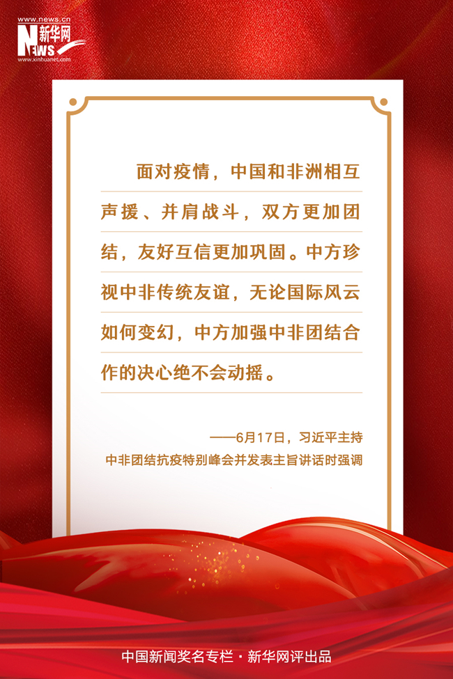 新老朋友通過視頻相聚,共商團結抗疫大計,共敘中非兄弟情誼。6月17日,由中國和非洲聯盟輪值主席國南非、中非合作論壇共同主席國塞內加爾共同發起的中非團結抗疫特別峰會舉行。國家主席習近平在北京主持了這一峰會,并發表題為《團結抗疫 共克時艱》的主旨講話,強調中非要堅定不移攜手抗擊疫情、推進中非合作、踐行多邊主義、推進中非友好,共同打造中非衛生健康共同體,推進中非全面戰略合作伙伴關系高水平發展。